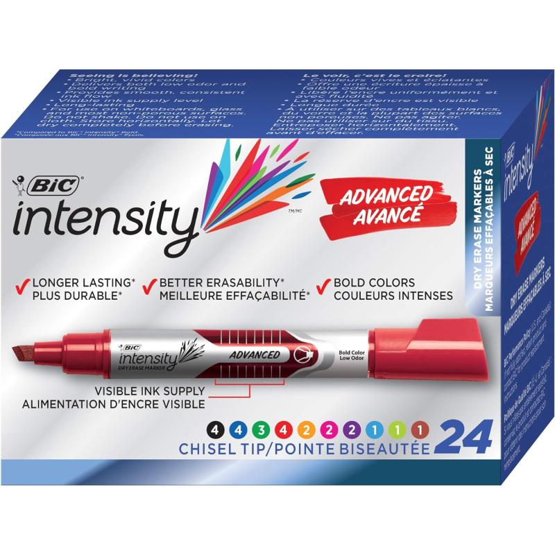 BIC Intensity Advanced Colorful Dry Erase Markers, Chisel Tip, 24-Count Pack of Assorted Colors, Whiteboard Markers for Teachers and Office Supplies(Assorted)