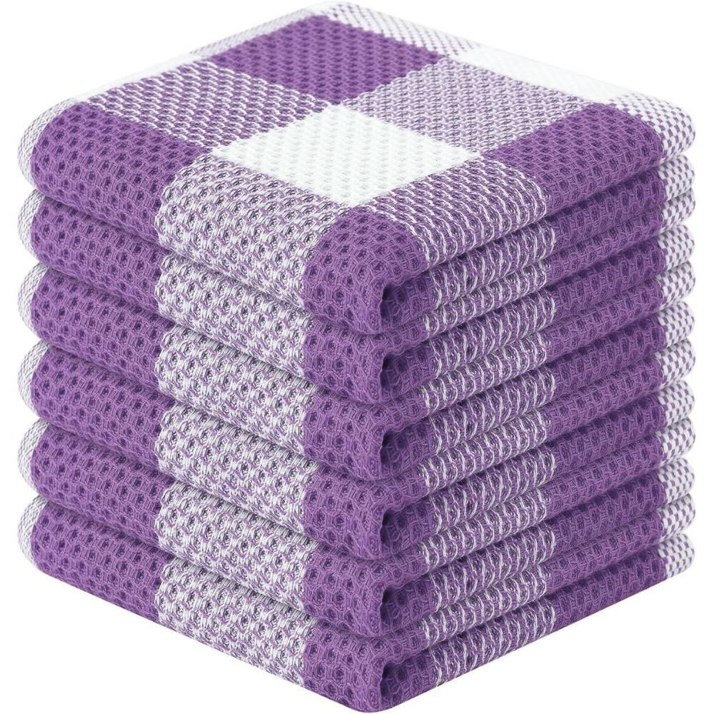 Homaxy 100% Cotton Waffle Weave Check Plaid Dish Cloths, 12 x 12 Inches, Super Soft and Absorbent Dish Towels Quick Drying Dish Rags, 6-Pack, White & Black(White & Purple)