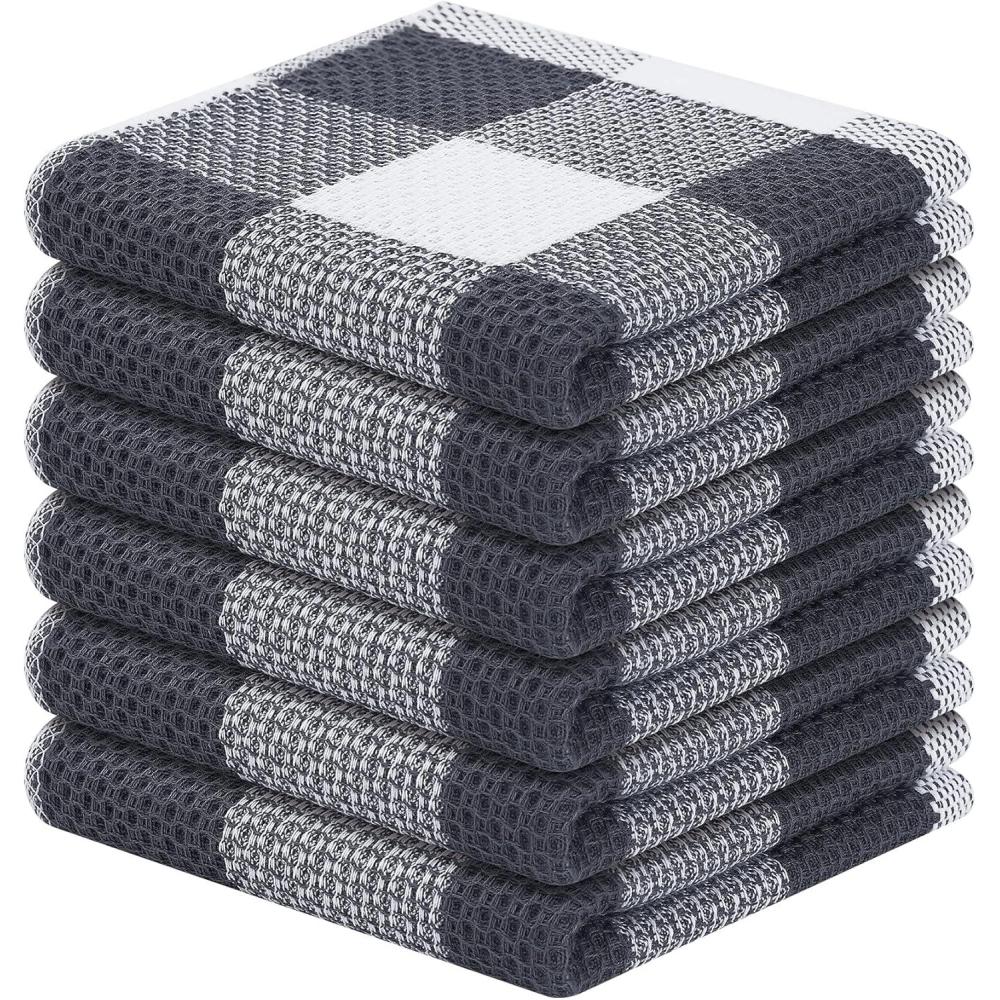 Homaxy 100% Cotton Waffle Weave Check Plaid Dish Cloths, 12 x 12 Inches, Super Soft and Absorbent Dish Towels Quick Drying Dish Rags, 6-Pack, White & Black(White & Dark Grey)