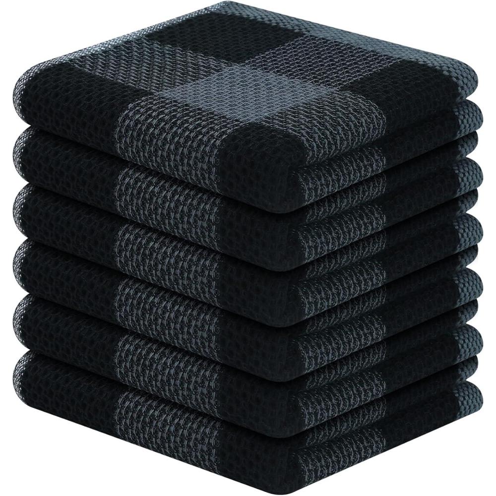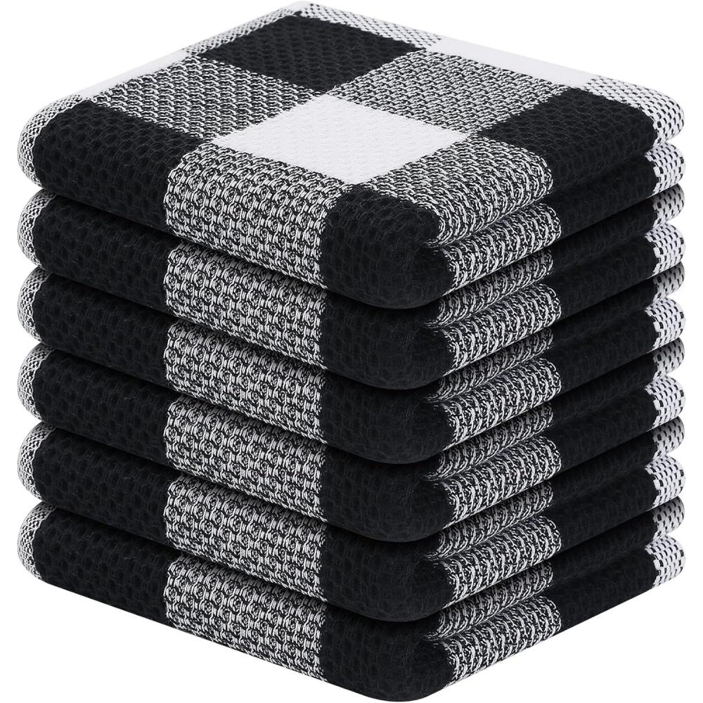 Homaxy 100% Cotton Waffle Weave Check Plaid Dish Cloths, 12 x 12 Inches, Super Soft and Absorbent Dish Towels Quick Drying Dish Rags, 6-Pack, White & Black(Black & Grey)