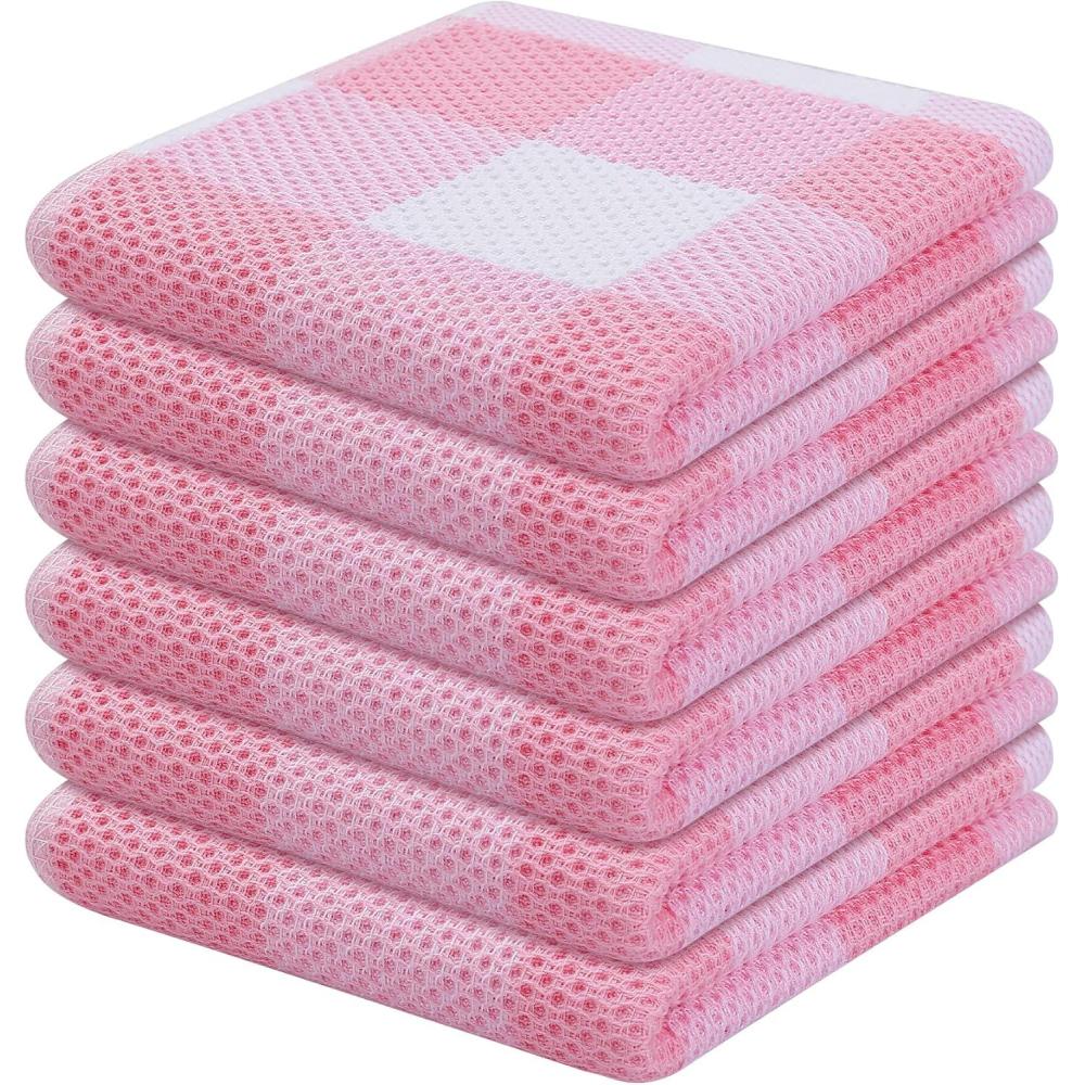 Homaxy 100% Cotton Waffle Weave Check Plaid Dish Cloths, 12 x 12 Inches, Super Soft and Absorbent Dish Towels Quick Drying Dish Rags, 6-Pack, White & Black(White & Pink)