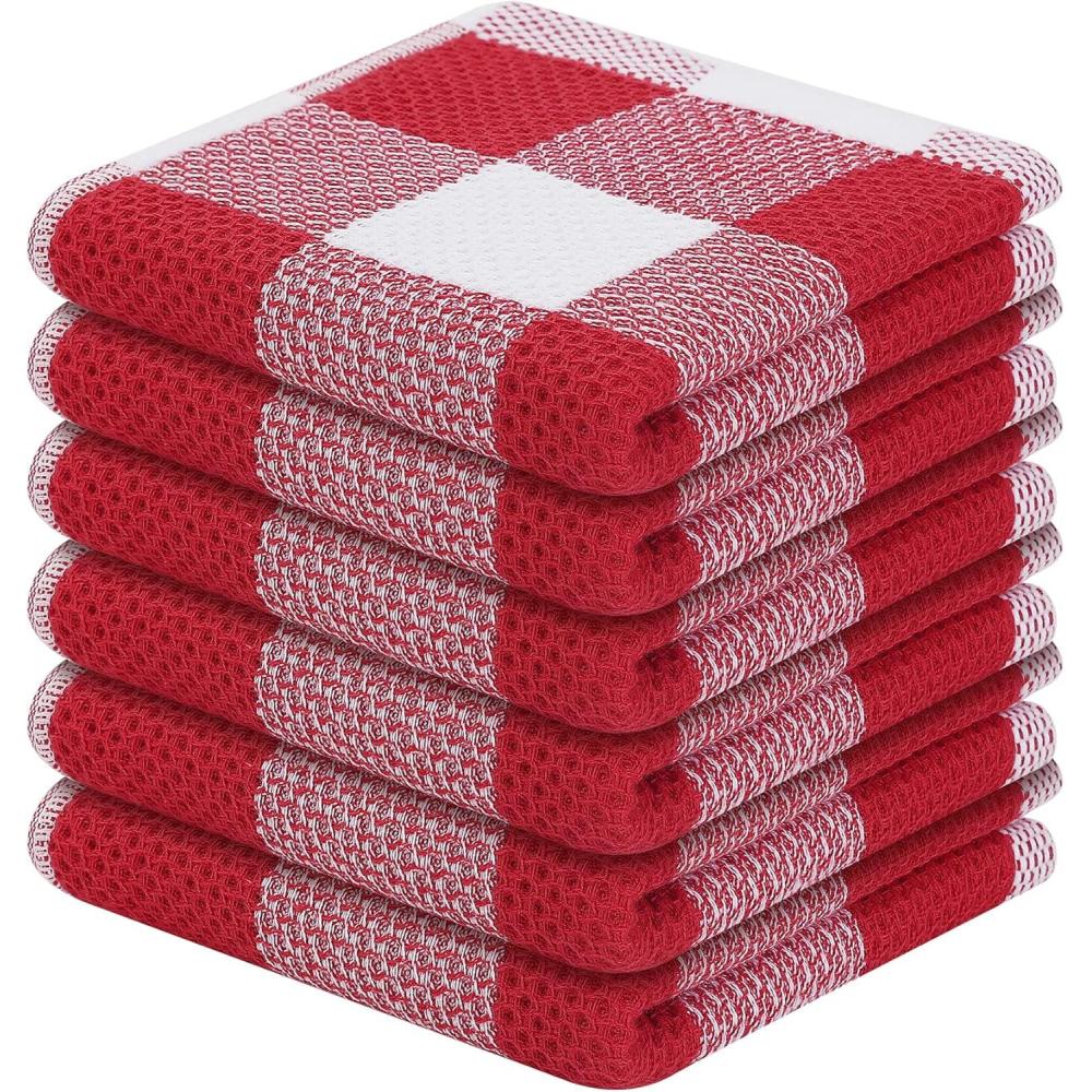 Homaxy 100% Cotton Waffle Weave Check Plaid Dish Cloths, 12 x 12 Inches, Super Soft and Absorbent Dish Towels Quick Drying Dish Rags, 6-Pack, White & Black(White & Red)