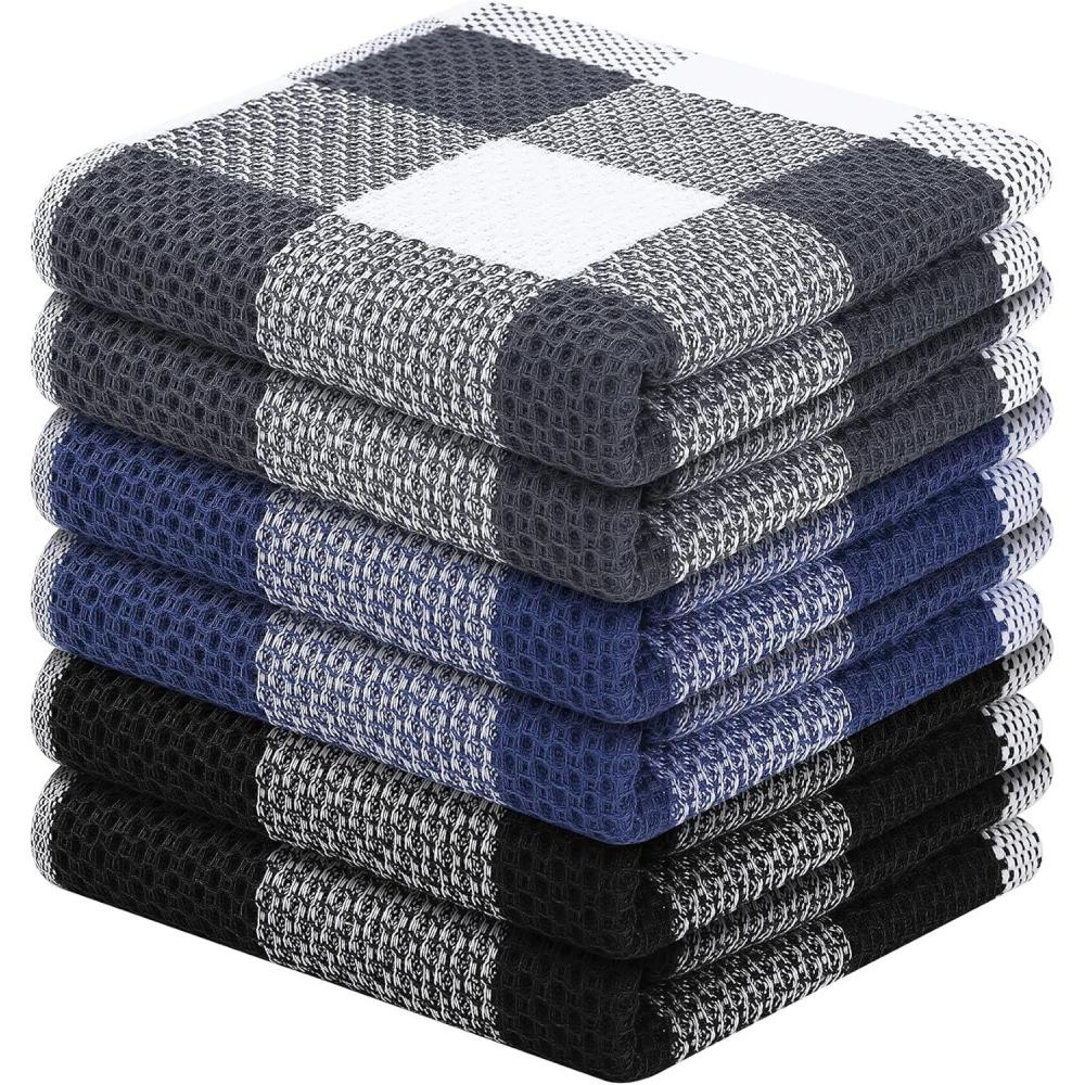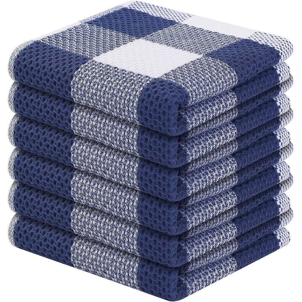 Homaxy 100% Cotton Waffle Weave Check Plaid Dish Cloths, 12 x 12 Inches, Super Soft and Absorbent Dish Towels Quick Drying Dish Rags, 6-Pack, White & Black(White & Navy Blue)