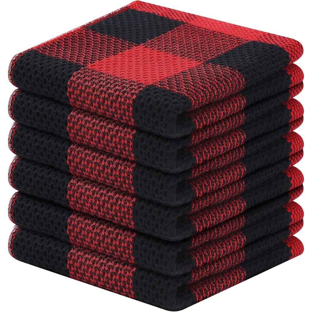 Homaxy 100% Cotton Waffle Weave Check Plaid Dish Cloths, 12 x 12 Inches, Super Soft and Absorbent Dish Towels Quick Drying Dish Rags, 6-Pack, White & Black(Black & Red)
