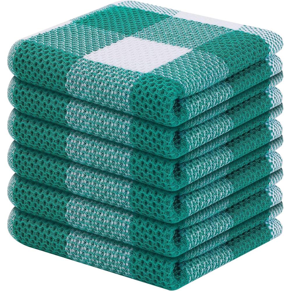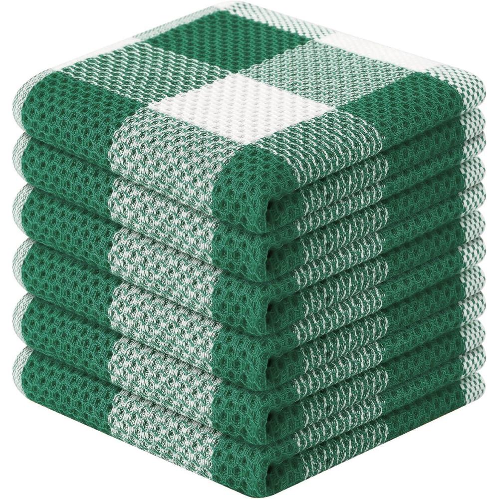 Homaxy 100% Cotton Waffle Weave Check Plaid Dish Cloths, 12 x 12 Inches, Super Soft and Absorbent Dish Towels Quick Drying Dish Rags, 6-Pack, White & Black(White & Dark Green)