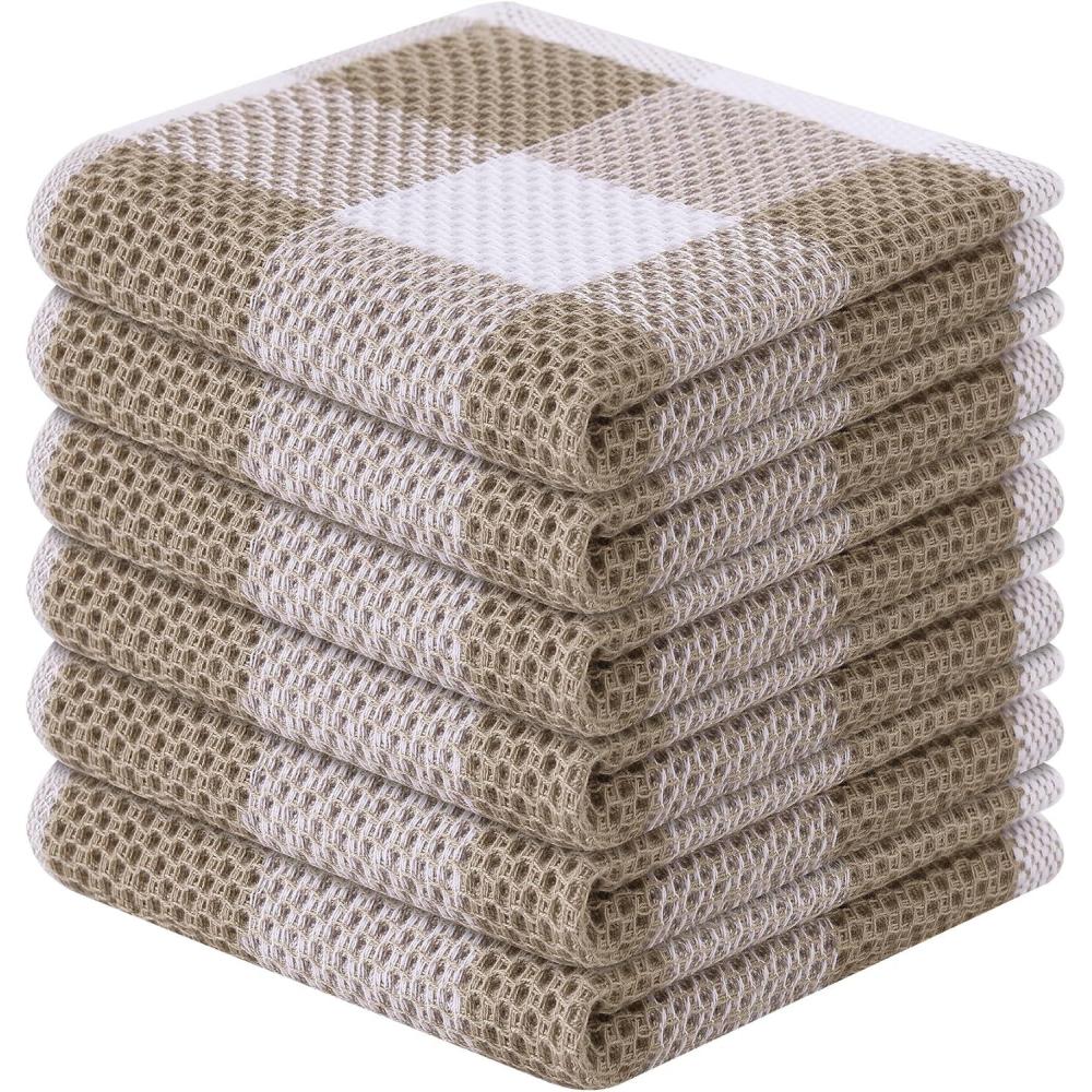 Homaxy 100% Cotton Waffle Weave Check Plaid Dish Cloths, 12 x 12 Inches, Super Soft and Absorbent Dish Towels Quick Drying Dish Rags, 6-Pack, White & Black(White & Khaki)