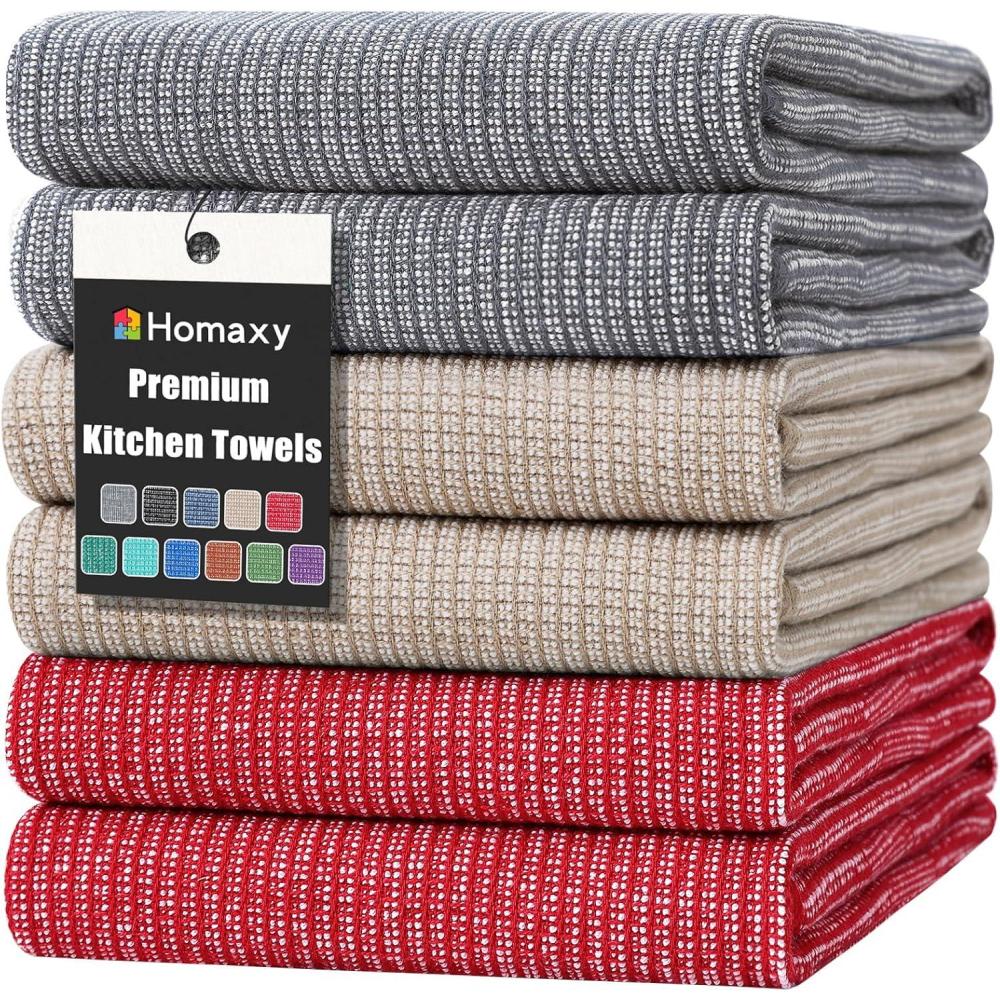 Homaxy Premium Kitchen Towels(18”x 28”, 6 Pack), Large Cotton Kitchen Hand Towels, Flat and Terry Dish Towels, 380 GSM Highly Absorbent Tea Towel Set with Hanging Loop, Red(Red/Grey/Khaki)
