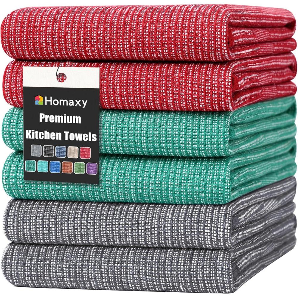 Homaxy Premium Kitchen Towels(18”x 28”, 6 Pack), Large Cotton Kitchen Hand Towels, Flat and Terry Dish Towels, 380 GSM Highly Absorbent Tea Towel Set with Hanging Loop, Red(Grey/Red/Green)