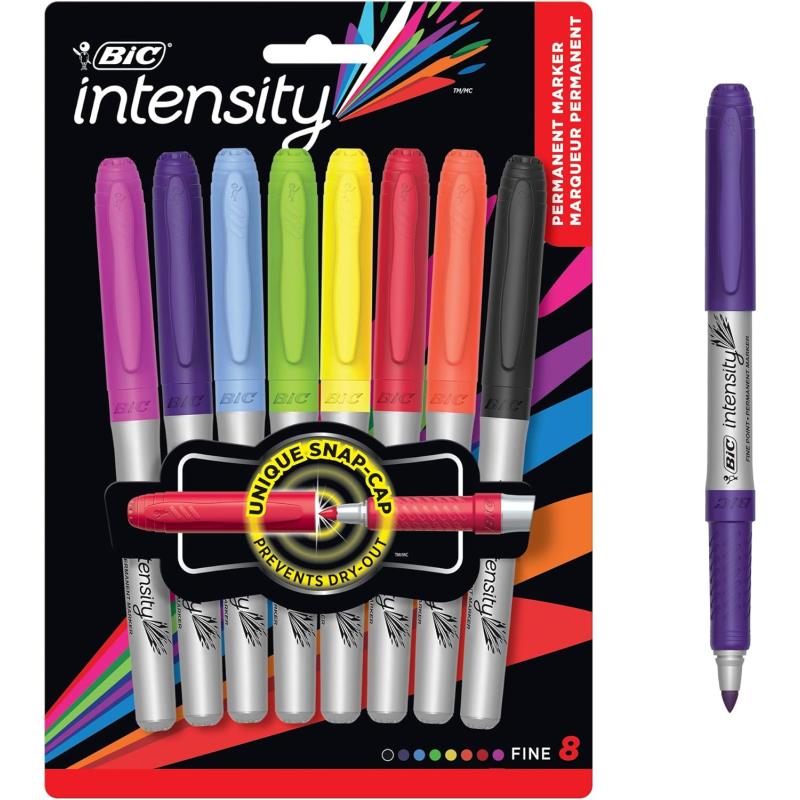 BIC Intensity Assorted Colors Fashion Permanent Markers, Fine Point, 8-Count Pack of Color Markers With Non-Slip Grip for Comfort and Control