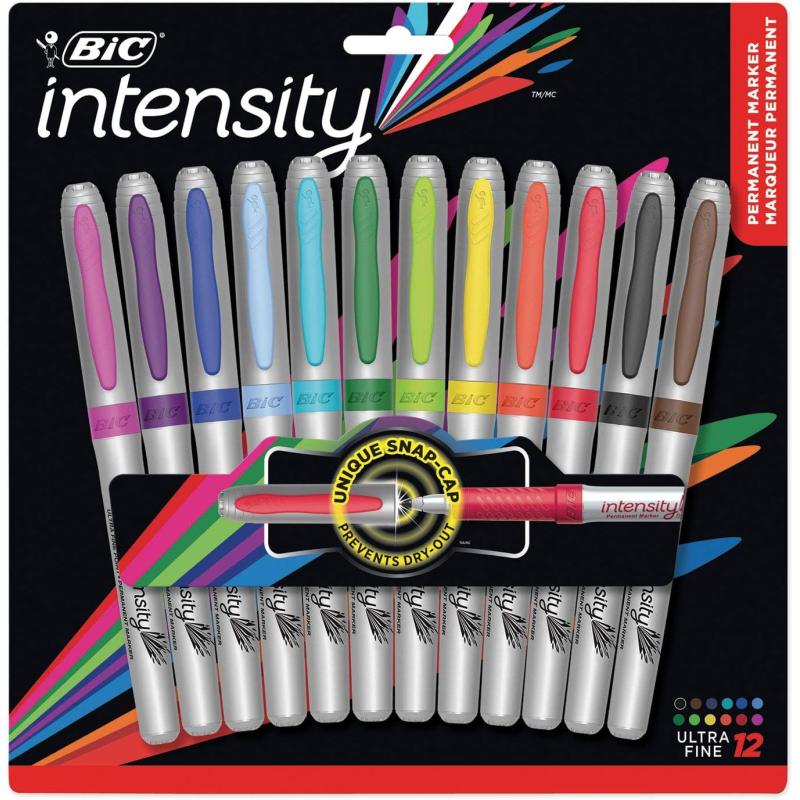 BIC Intensity Fashion Permanent Markers, Ultra Fine Point, Assorted Colors, Non-Slip Grip For Comfort & Control, 12-Count