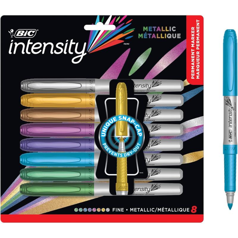 BIC Intensity Metallic Permanent Markers, Fine Point, 8-Count Pack of Metallic Markers (Assorted Colors May Vary) With Non-Slip Grip for Comfort and Control(1 Count (Pack of 8))